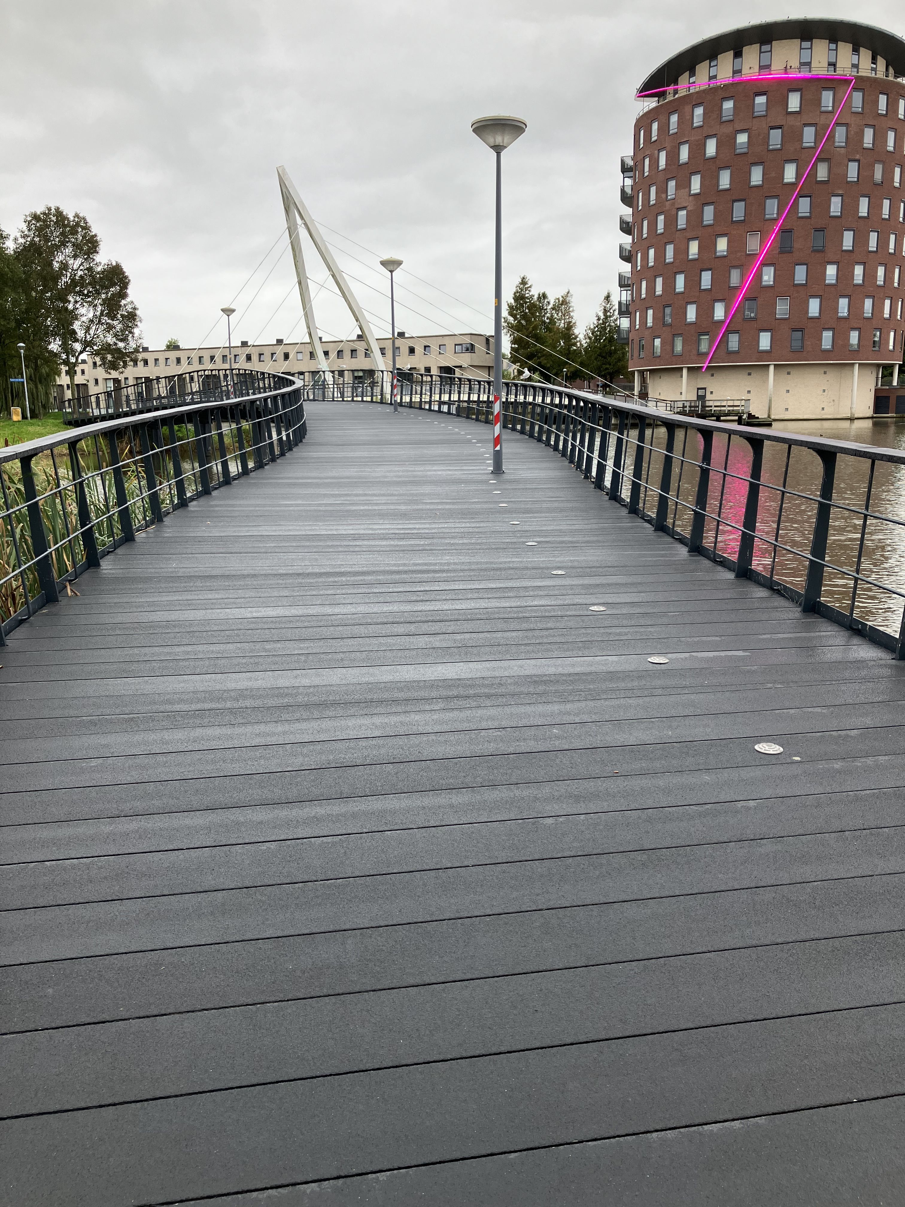 Onze freesmachines maken het mogelijk om voorbewerkte GVK profielen en GVK brugdekplanken te leveren aan onze opdrachtgevers. Zo ook het geval bij de renovatie van de Rietbrug in opdracht van Griekspoor voor de Gemeente Nieuw-Vennep. Zoals te zien op de afbeelding is deze overspanning namelijk niet rechttoe rechtaan. Integendeel zelfs.