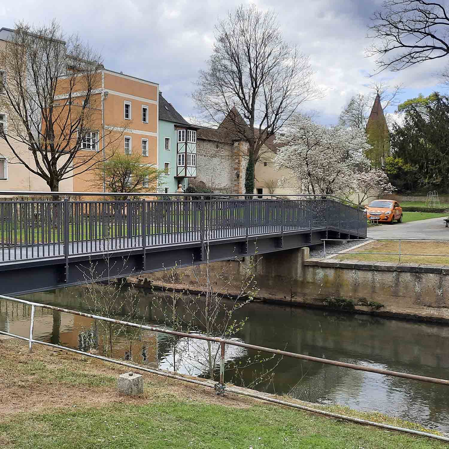The old pedestrian bridge, which was also used as a cycle bridge, near the "Englischen Garten" in Amberg was in dire need of replacement. Weather, age and heavy use had rendered the old bridge unsafe. With the installation of an FRP Bridge Deck, the city of Amberg opted for a sustainable replacement. Not only was the replacement FRP Bridge Deck mounted on the old steel structure; the bridge was also anchored into the ground. As such, the FRP Bridge Deck comfortably remains on the steel structure, even during high water and flooding. Moreover, the bridge is wider than the old bridge, allowing pedestrians and cyclists to pass each other safely.